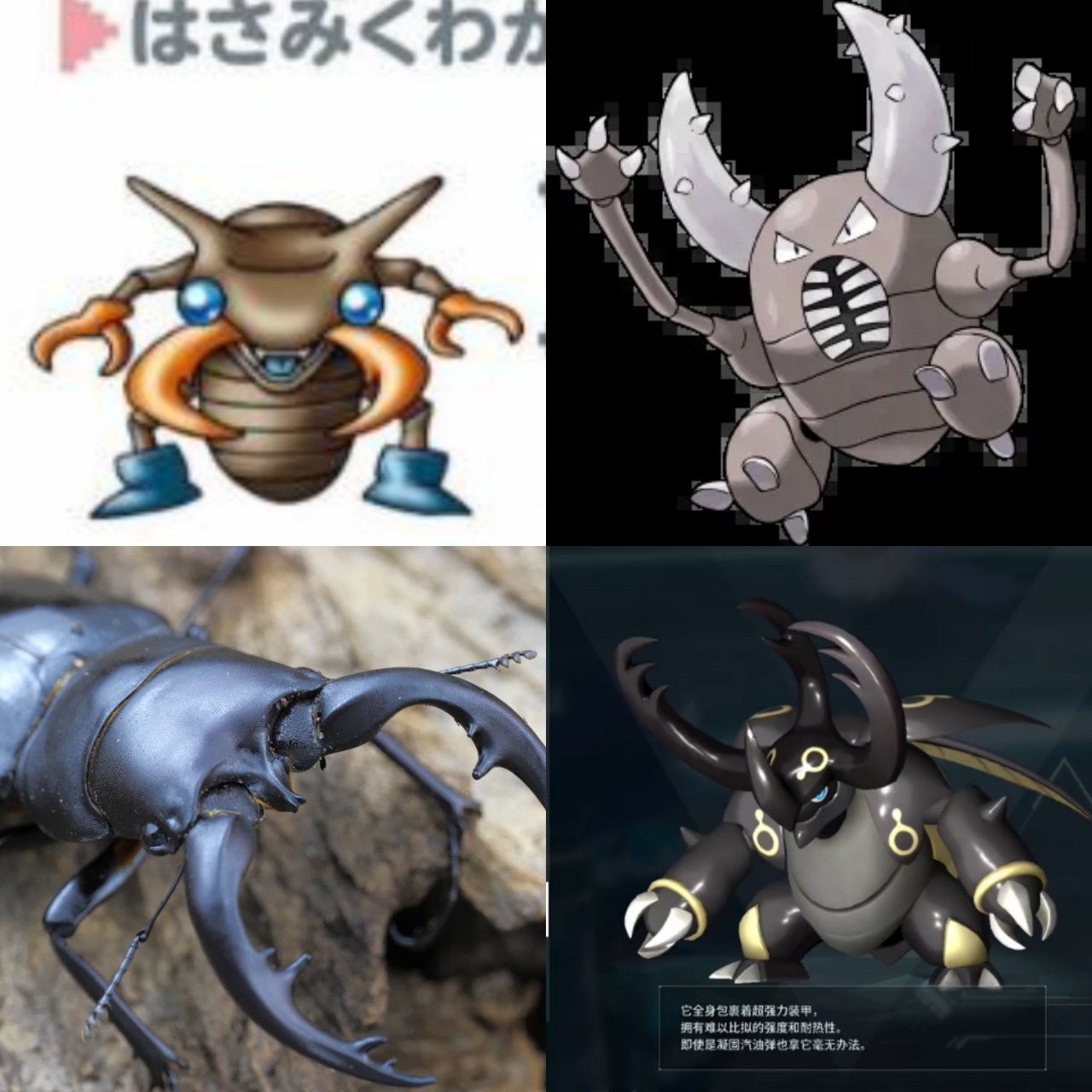 最後放三個鍬形蟲原型的設計,分別來自勇者鬥惡龍,寶可夢,幻獸帕魯,抄了嗎?如抄,原型就長這樣,不這麼畫還能咋辦?