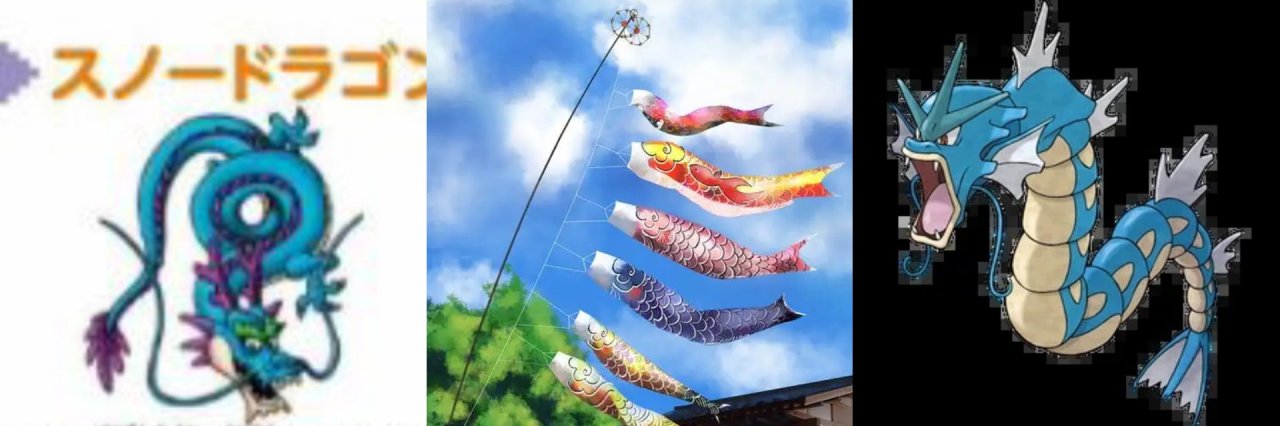 然後是最冤的暴鯉龍,勇者鬥惡龍這個直接照搬的東方龍形象基本沒怎麼設計,暴鯉龍爲了貼近鯉魚躍龍門的進化鏈,特意設計了無足的身體,因爲原型來自鯉魚旗🎏