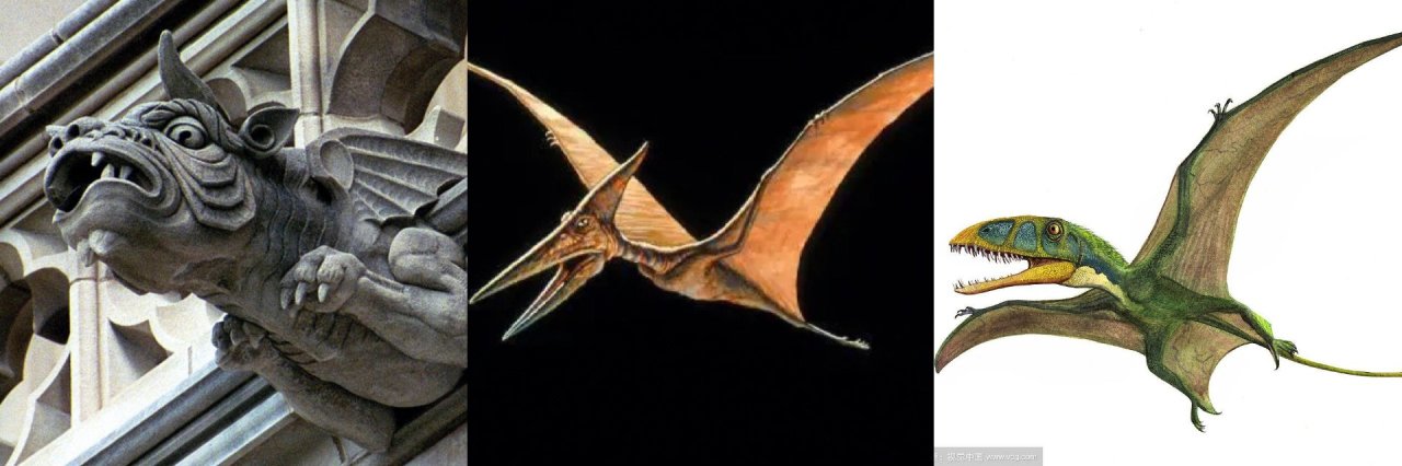依然是舉例還不如我找的像,左邊是デンタザウルス,原型是暴龍+西方有翼龍,中間的和化石翼龍的原型纔是翼龍,不過一個更接近無齒翼龍,一個更接近雙齒翼龍。除此之外,化石翼龍寬大的下巴還來自石像鬼。