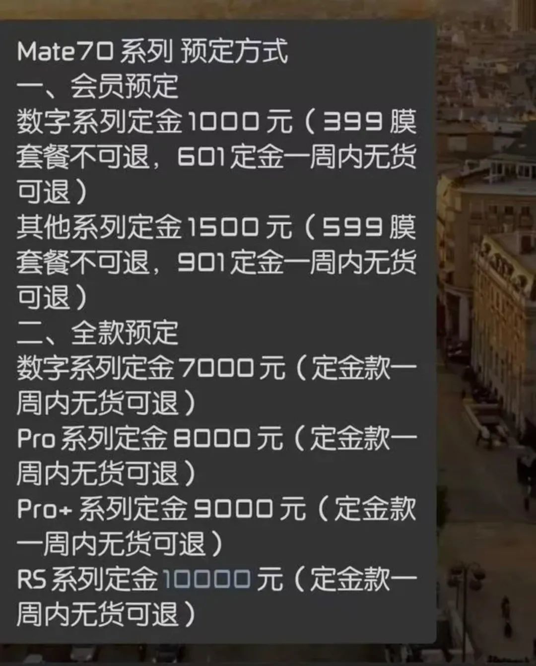據爆料,線下渠道預定有兩種方式,會員預定標準版Mate70的定金爲1000元,其他系列的定金爲1500元。