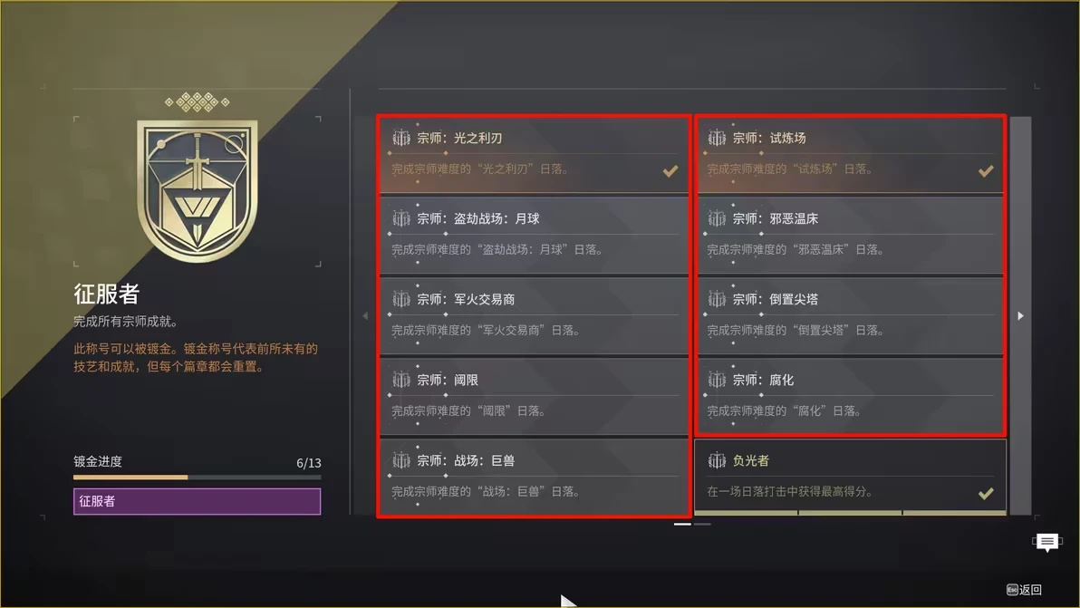備註:沒有紫征服者看不到鍍金節點,需要每週跟着打宗師日落