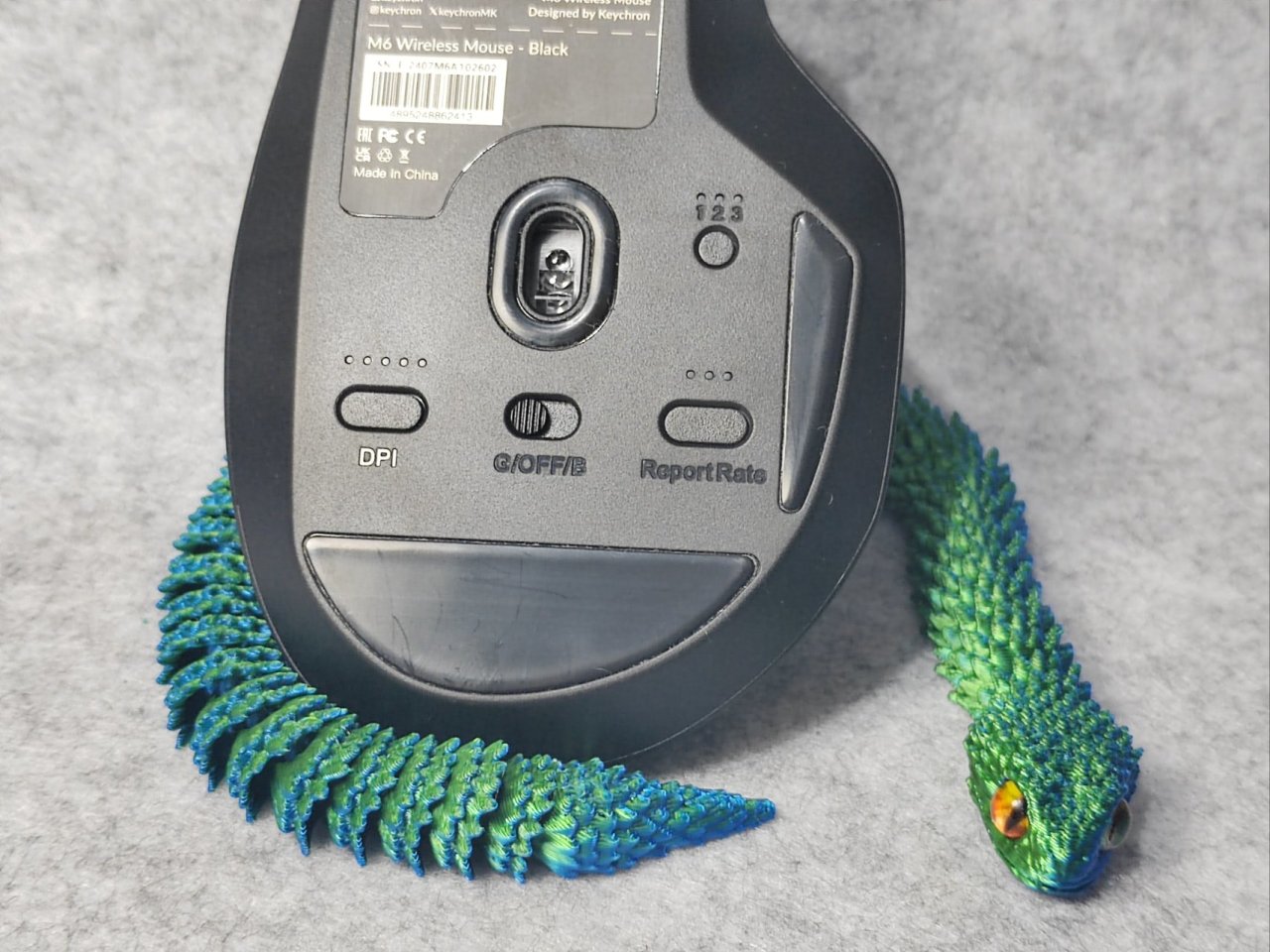 再來看看底面,腳墊是PTFE特氟龍腳貼,滑動起來很舒服。除開中間的模式切換鍵位,還有三個鍵位,分別是藍牙記錄按鍵:m6有三套藍牙目標設置可記錄,按下該鍵可快速切換;DPI切換按鍵:提供五檔,上方有五個指示燈;回報率切換按鍵:普通版本的m6可在125、500、1000hz三檔切換,4k版本則增加了2000、4000hz。現在大多數鼠標的回報率只能在驅動中切換。渴創m6添加的這個按鍵增加了便捷性。
