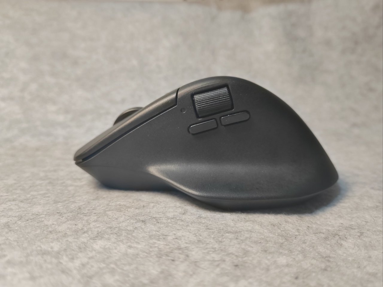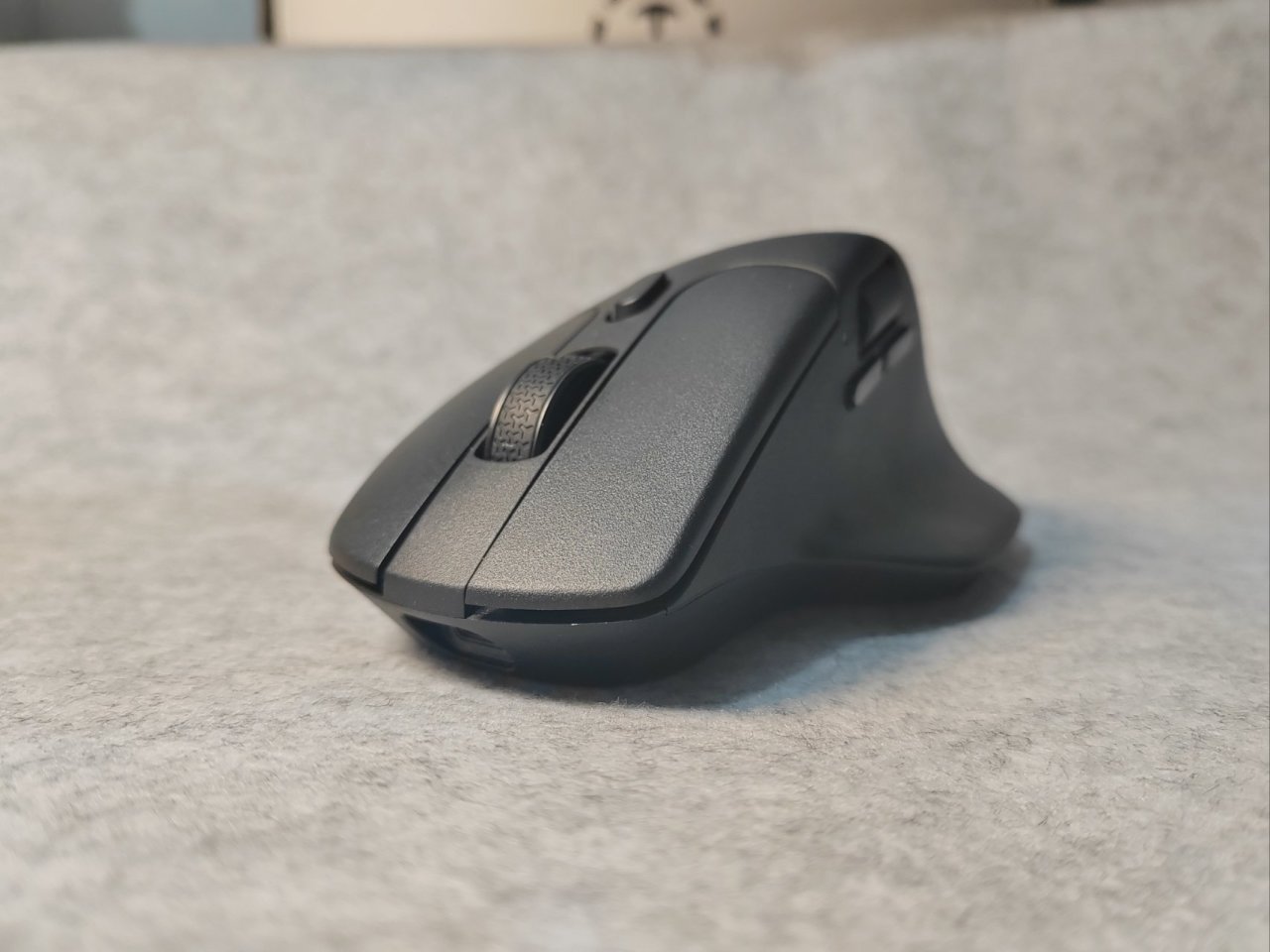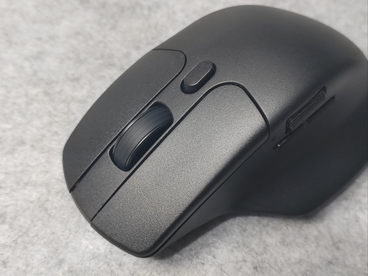 來看我手上的黑色款。渴創m6爲不對稱右撇子設計。正面整體很素,不搞花裏胡哨的。整體很修長,在大拇指處做了人體工學指託。比較突出的就是滾輪下的無極切換按鍵了,使用這個物理開關可以實現雙模滾輪切換。