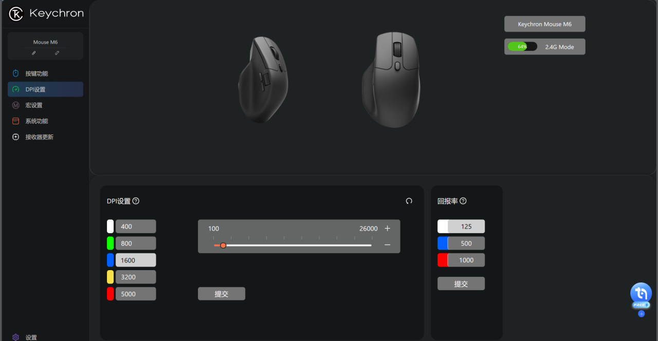 最後是驅動,渴創的驅動爲完全的線上驅動,在簡單的匹配後便可直接通過網頁進入驅動設置。除開宏編輯外還可以對五檔dpi的具體數值進行調節。大家入手後可以自己登錄網頁試試。