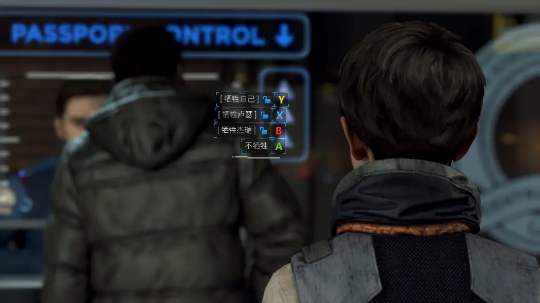 35.Safe Harbor(避风港):让卡拉与爱丽丝越过边境。在第三十一章:为底特律而战中,卡拉选择不还车票,乘车进入边境后有两种方法度过。1.在舆论为支持的情况下,卡拉可以选择不牺牲,边境的检察员会直接放行。2.在舆论为支持以下的情况下,需要在第三十章:灵魂之夜中选择拯救卢瑟,这样在边境可以选择牺牲卢瑟或者牺牲杰瑞越过边境。