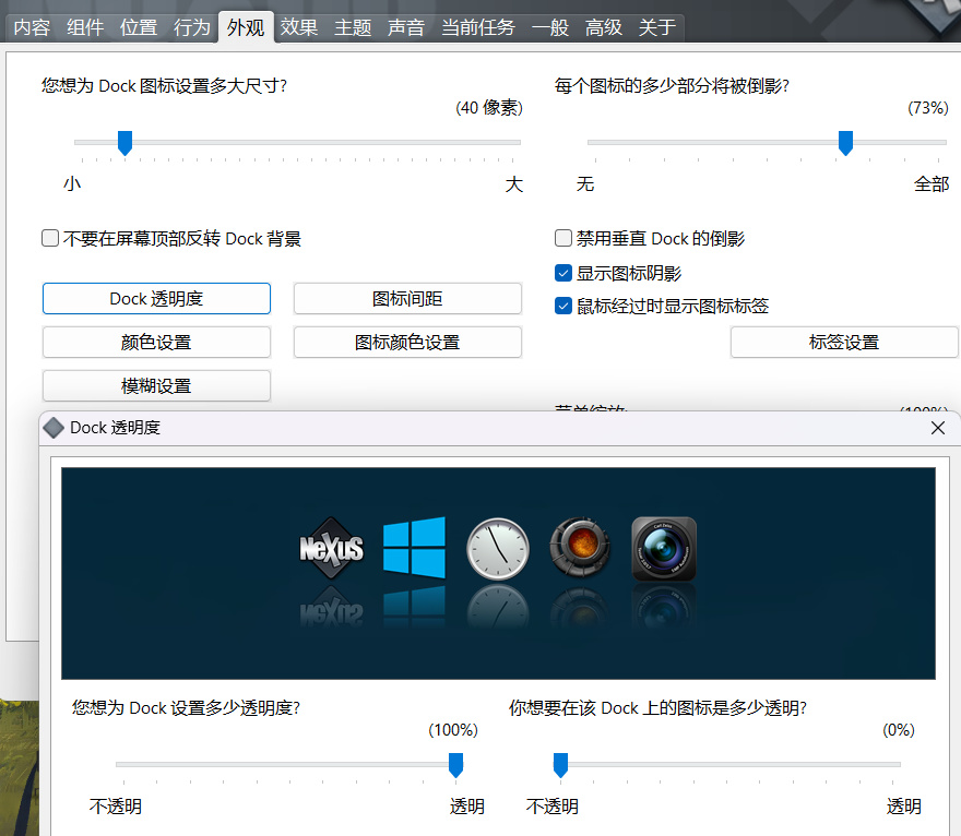 “外觀”這邊可以進一步對應用欄的透明度和倒影,進行修改