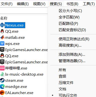 在everything中找到想打開的文件路徑,注意,everything的“搜索”窗口是可以選擇僅搜索“可執行文件”的