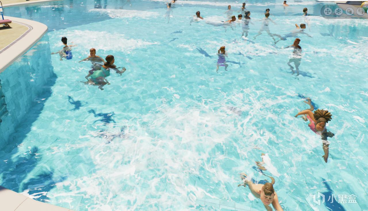 遊戲帶來了一套全新的水上樂園,這裏有新的設施,包括更衣室、烘乾機等,還有新的滑倒系統和泳池系統,同時遊戲也爲遊戲引入了與之配套的泳池安全度和潔淨度等概念,整體看來,水上樂園系統是豐富和成熟的,爲遊樂園設計開闢了一種全新的可能性。但是,爲什麼寫到這裏,作者卻湧上了一個奇怪的問題,爲什麼過山車之星的迭代核心賣點會是水上樂園,不過想想也是,如果沒有它,那不就成過山車之星1PROMAX版本了嗎?但必須要提及的是本作的視覺部分得到了顯著改進,在水面處理和光照效果上帶來了相當優秀的視覺體驗。