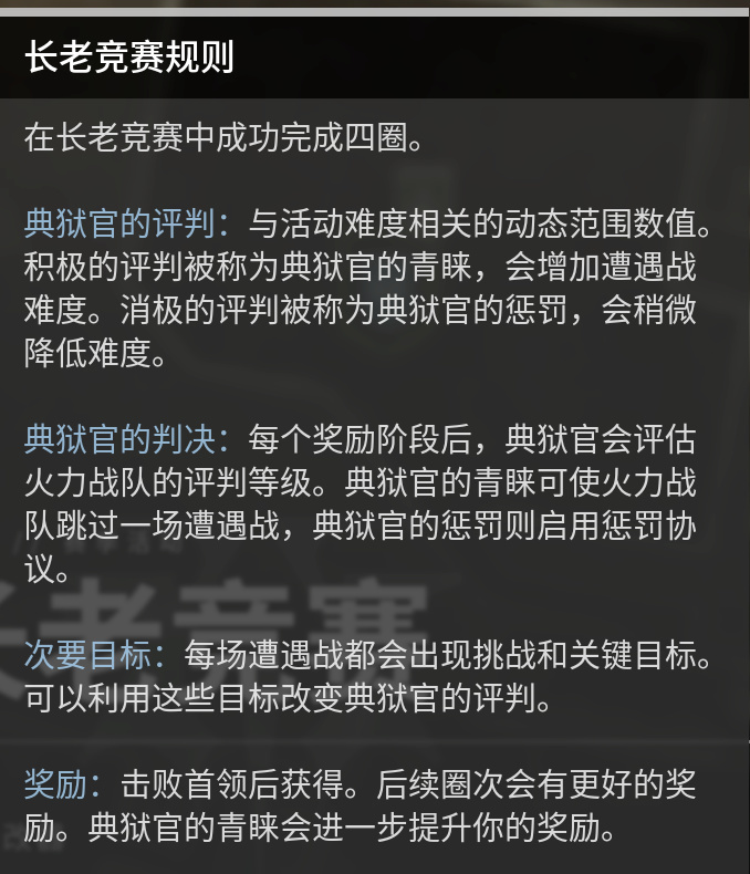 完成挑戰會加一層典獄長的青睞層數和彈藥箱獎勵 反之會減少典獄長的青睞層數 最高三層