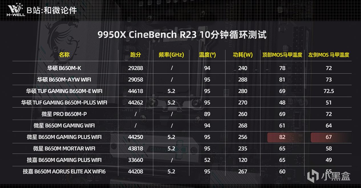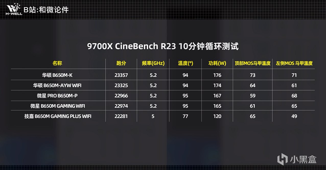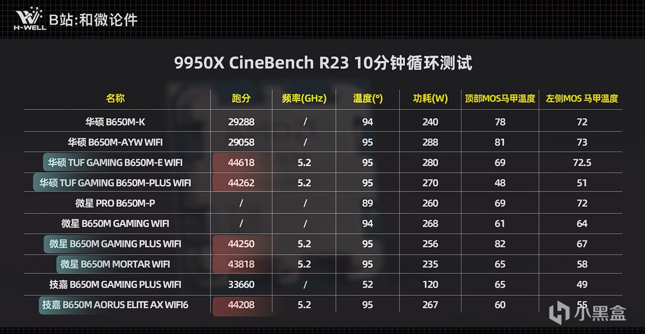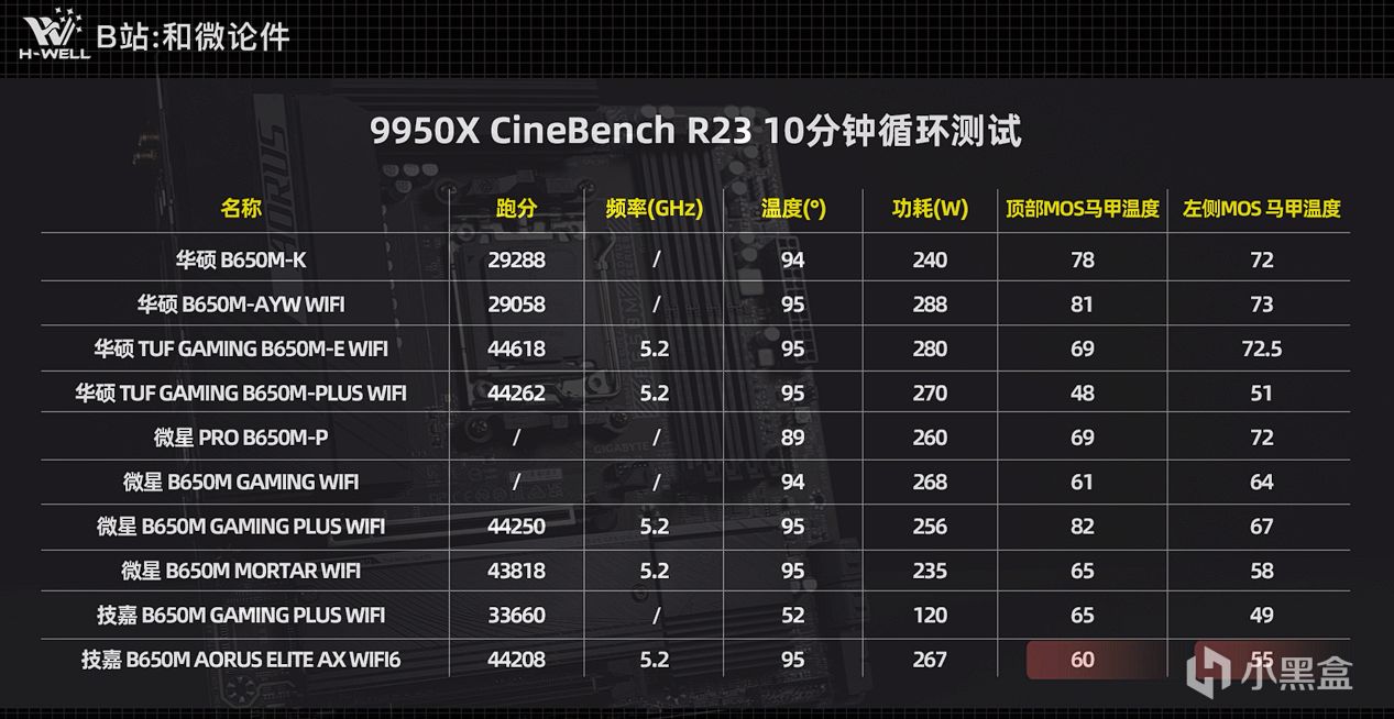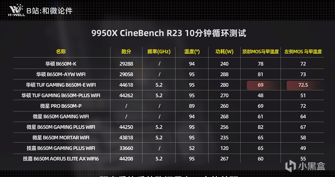 華碩的B650M-K與B650M AYW 2張主板跑分最高,得分爲23000多分,這兩張主板因爲AYW 的馬甲面積更大,所以它在溫度上的表現要比-K好很多,左側馬甲是低了10度。