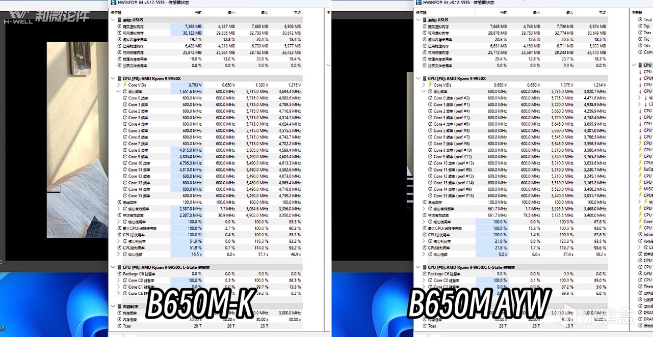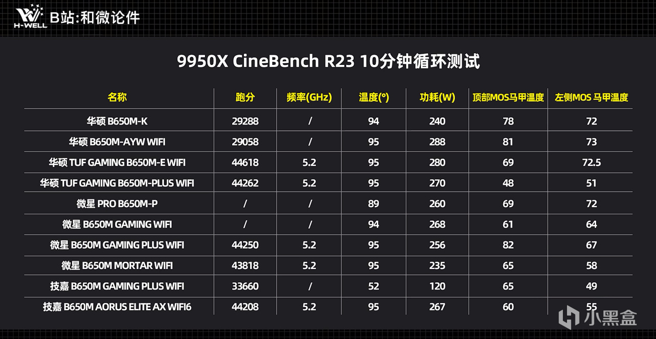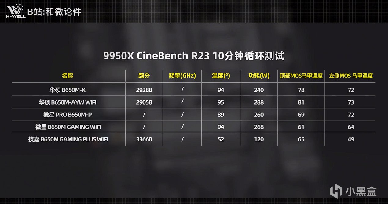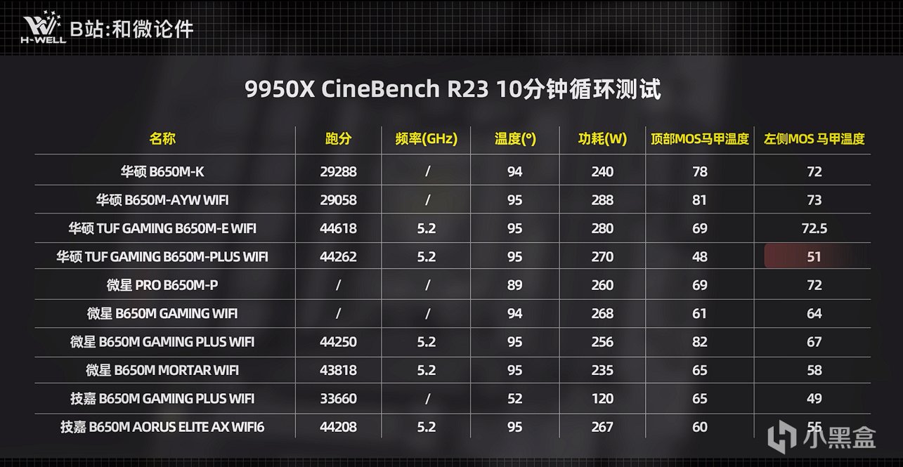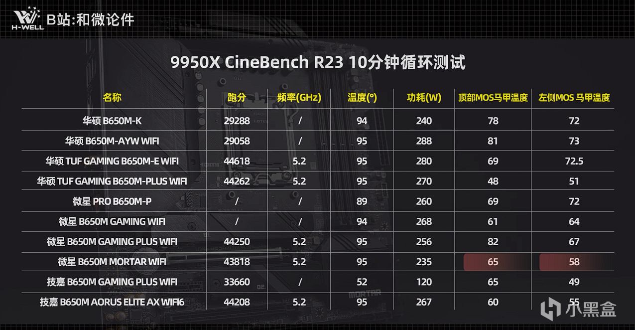 華碩的B650M-K與B650M AYW 2張主板跑分最高,得分爲23000多分,這兩張主板因爲AYW 的馬甲面積更大,所以它在溫度上的表現要比-K好很多,左側馬甲是低了10度。