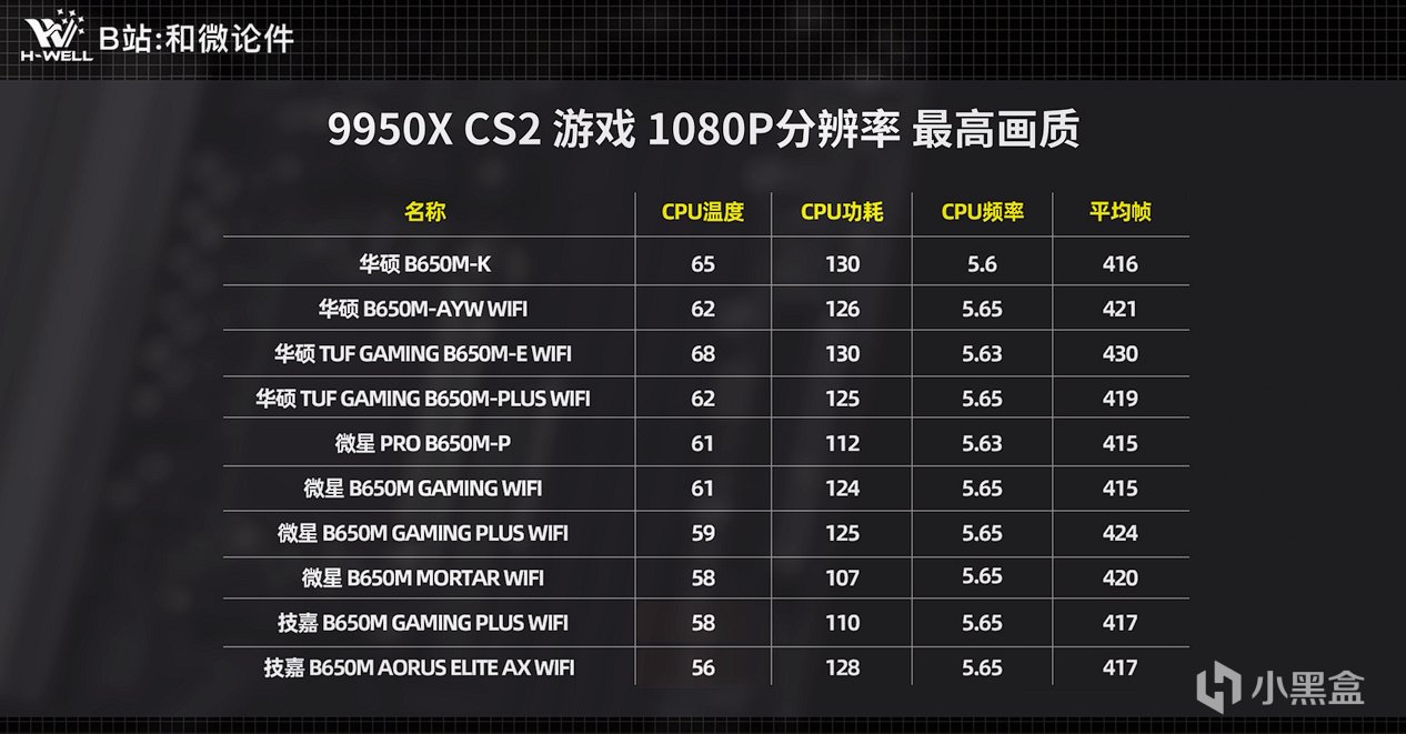 這10張主板在CPU均爲9950X時,平均幀數是都跑在了415-430幀之間,頻率也都維持在5.6Ghz以上,華碩的主板普遍在功耗和溫度對於其它兩家更高,平均幀最高的自然也在華碩這裏,TUF B650M-E是跑出了平均430幀的幀數表現,平均幀位列第一。
