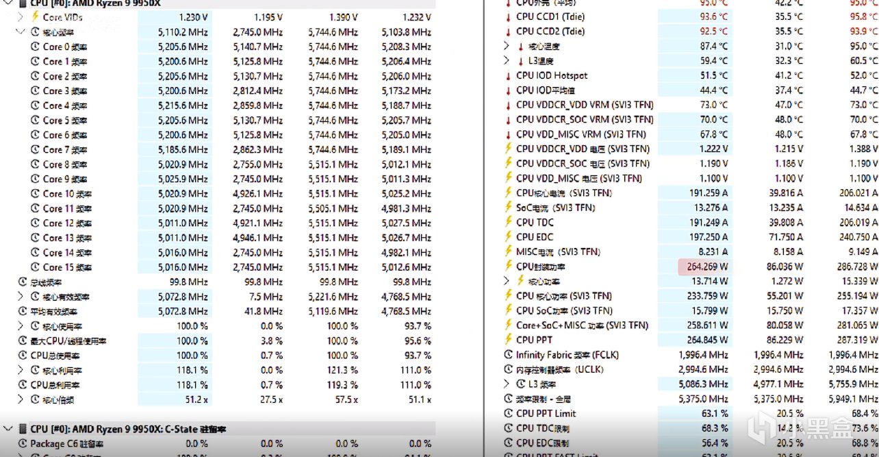 在烤機5分鐘後都出現了降頻現象,所有核心的頻率是跑在了0.6Ghz,用它們來跑9950X的確是有點勉強了,但是依然是堅持跑滿了全程。