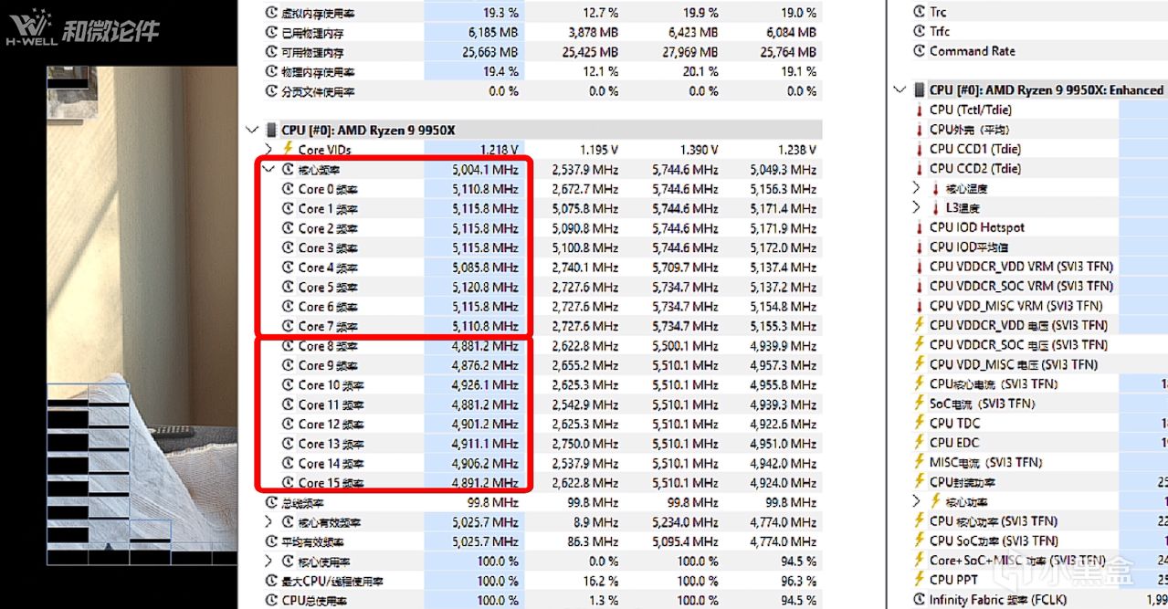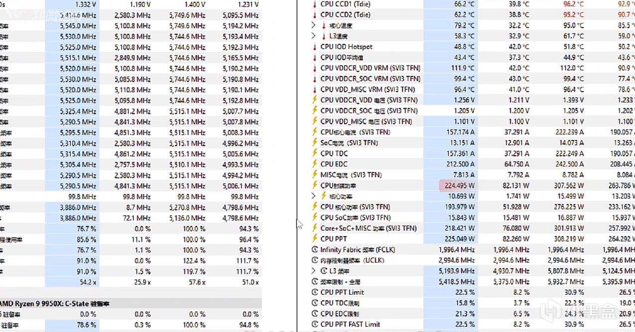 首先華碩這裏的TUF B650 重炮手,它的供電不僅將9950X CCD0頻率維持在5.5Ghz,CCD1也能維持在5.3Ghz完全跑滿。