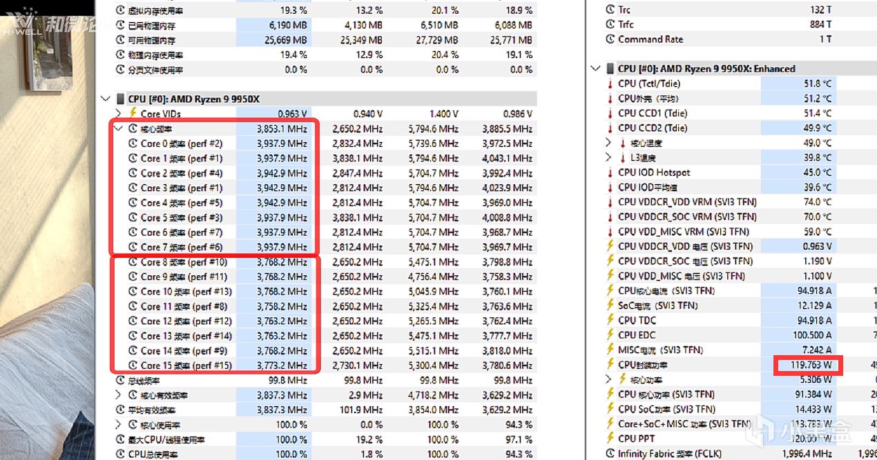 技嘉的2張主板,小雕之前也有提到,配備了1根6mm的熱管,在遊戲項目實測環節溫度是最低的。而9950X在該主板上跑滿功耗與華碩不相上下。