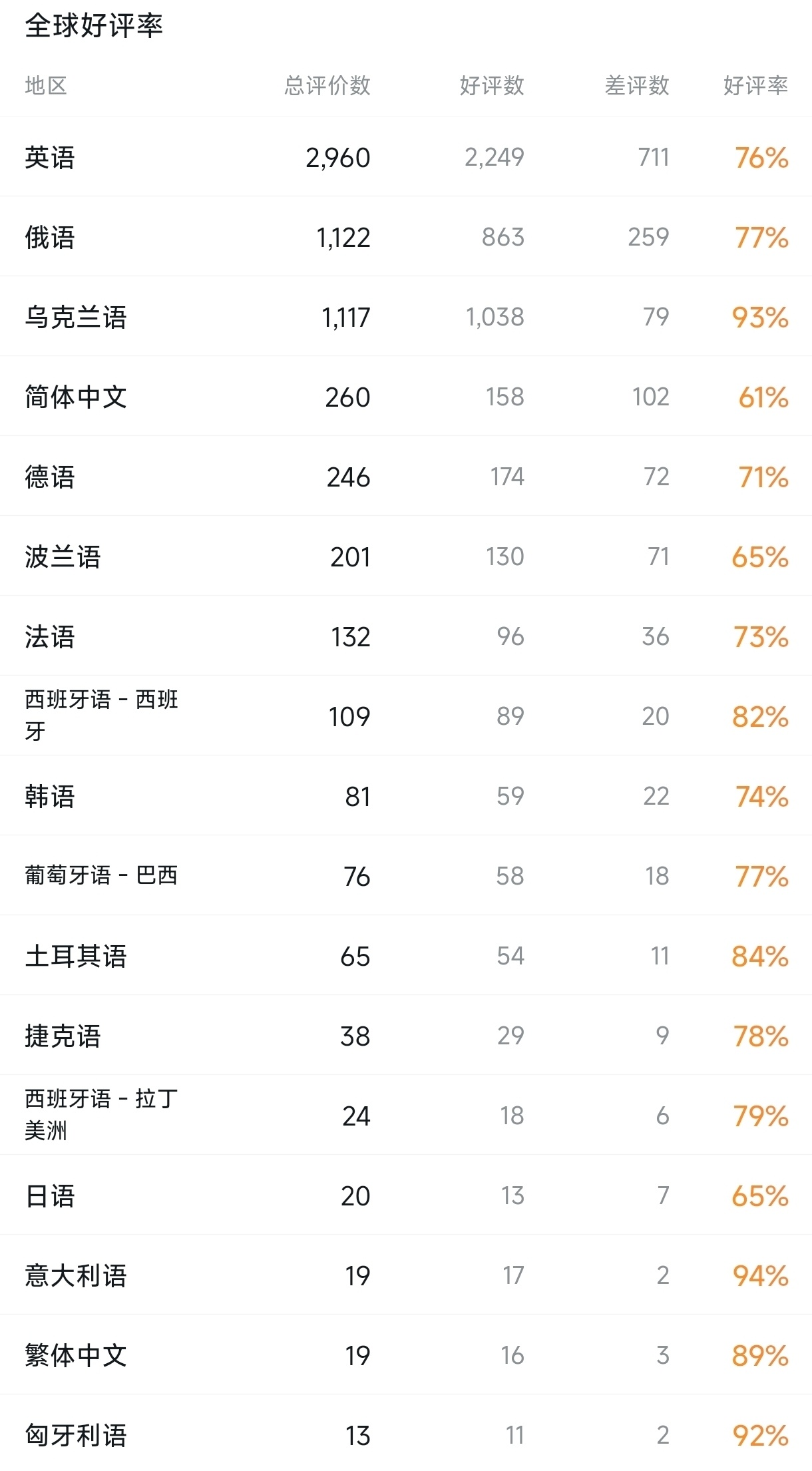 结合小黑盒的数据来看,在国区的评价不是很好,西班牙、乌克兰等外区评价反而很好,英和俄属于中等偏上。