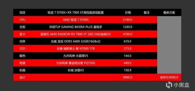 這套配置基於銳龍 7 9700X+RX 7900 XT打造而成,雖然相較第一套配置價格上浮了2000元,但能在高分辨率、高特效下暢玩的遊戲無疑更多,同時也由於銳龍 7 9700X價格一降再降,所以整體下來居然比雙十一期間便宜了不少錢。