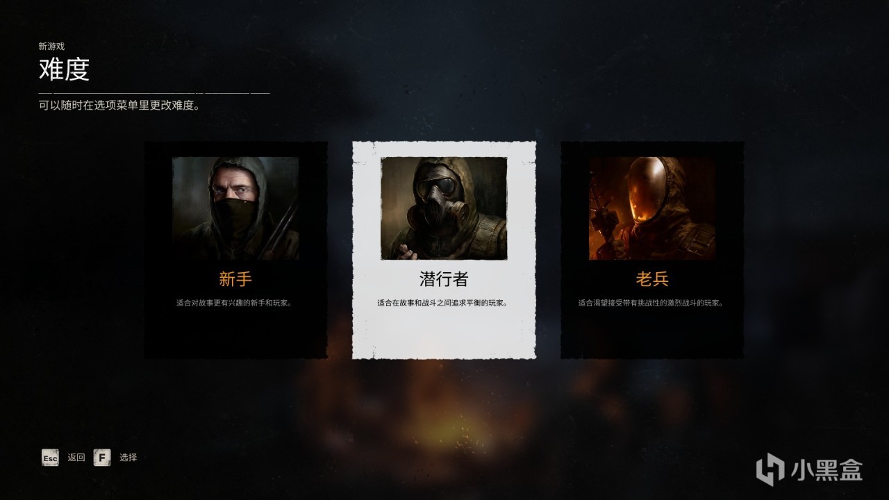 遊戲提供了三個可選難度,新手、潛行者與老兵,初次上手的話建議在前兩個難度中選擇一個,我這裏選擇了適中的潛行者難度,即便如此體驗下來還是非常硬核的。