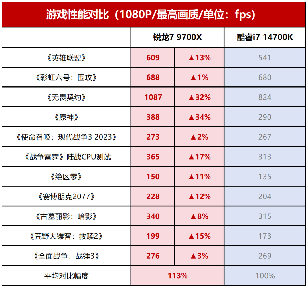 从我们测试的11款游戏来看,锐龙7 9700X已经实现了对酷睿i7 14700K的完胜。在《无畏契约》和《原神》中甚至相对酷睿i7 14700K领先了30%以上,优势十分夸张。而在《英雄联盟》《战争雷霆》《绝区零》《赛博朋克2077》《荒野大镖客:救赎2》中的优势也超过了10%。综合全部游戏的优势进行平均,锐龙7 9700X相对酷睿i7 14700K的优势大约为13%,差不多等于两代处理器之间的差距了。