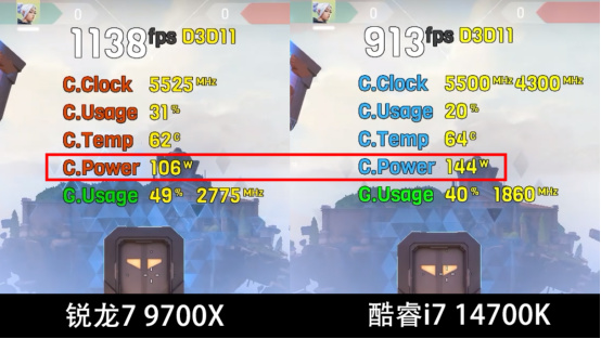 此外,在游戏功率方面,锐龙7 9700X也是完胜酷睿i7 14700K的。从游戏实时监测数据可以看到,《无畏契约》同场景下,锐龙7 9700X的功率为106W,而酷睿i7 14700K的功率则达到了144W,高出36%之多。而且值得注意的是,锐龙7 9700X除了默认的65W TDP功率设定之外,AMD还专门解锁了105W TDP模式,在这个模式下它的满载封装功率可达140W,远远超过游戏中的功率需求,因此可以在游戏中火力全开,而温度控制比完全解锁功率更出色。因此对于游戏玩家来讲,建议使用锐龙7 9700X的105W TDP模式,获取能效比黄金平衡的使用体验。