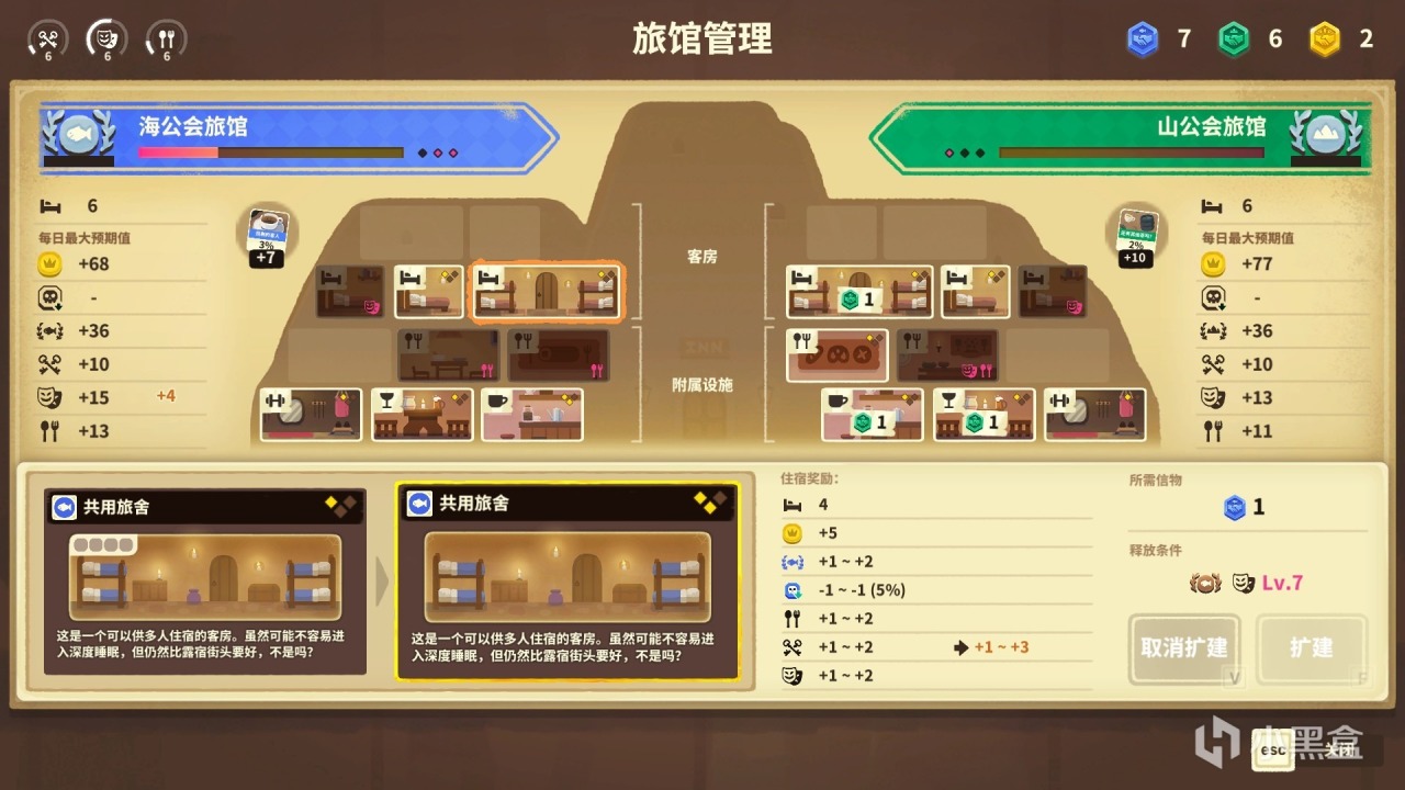 游戏的运营养成部分也跟故事本身做了一定的结合,玩家可以用赚取到的公会币来解锁旅馆内有着全新功能的房间,或者扩建升级现有的客房、餐厅等房间,而如果能在每个关卡都完成额外目标且超额赚取到金币,还能够在给巨龙上贡后获得额外的奖励,来让黑店解锁或升级更多的房间,带给玩家的成就感也是实实在在的。