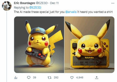 而根据Eric的说法,这些推文里的图是都是由AI工具100%“原创”的,因此就算将这些图案印在商品上进行出售,这些IP的持有者也没有追索权——它们属于公共领域,并不受版权保护