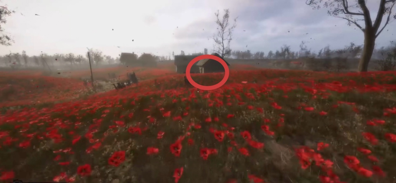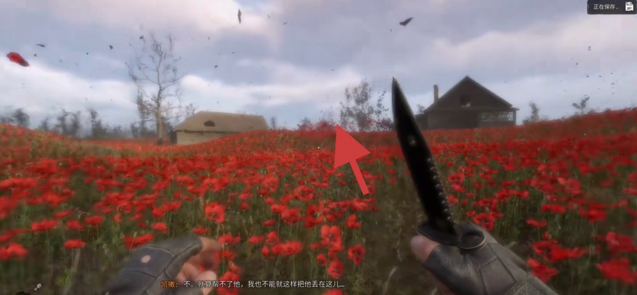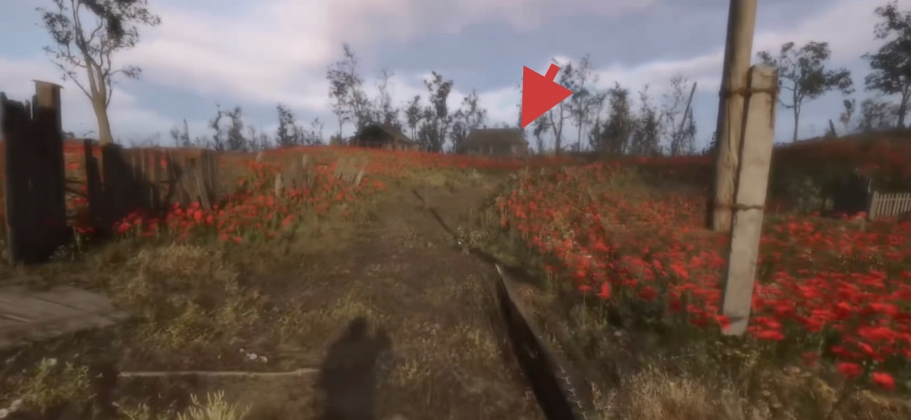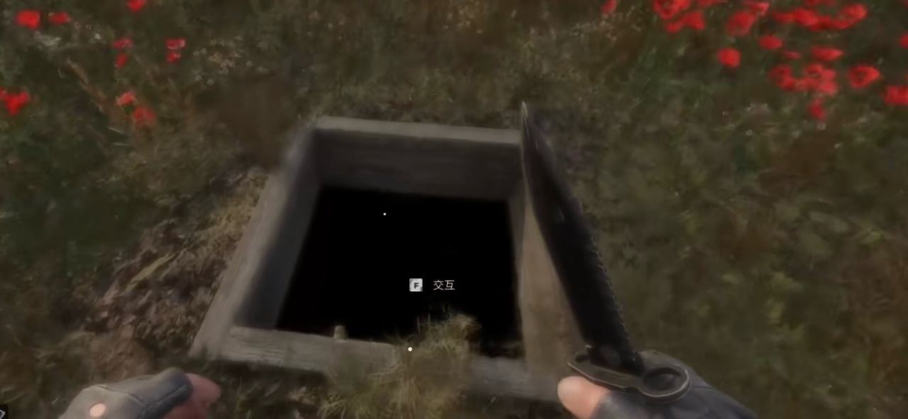 從大門出去往右看,會看到一間頂部已斷裂的房子,我們沿他的反向過去會看到一具屍體,正對屍體往前走一段會發現一座地窖