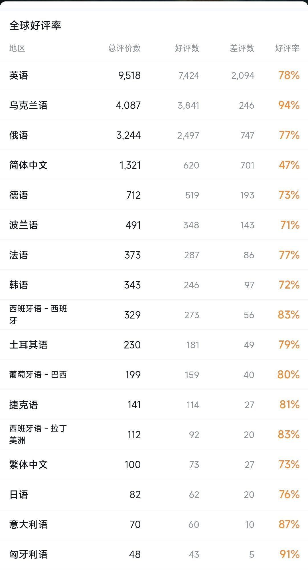 從黑盒給出的steam全球好評率中,肉眼可見的“簡體中文”好評率甚至連一半都沒達到,這裏我分別列出大家所提及的一些問題,和自己的一些看法~