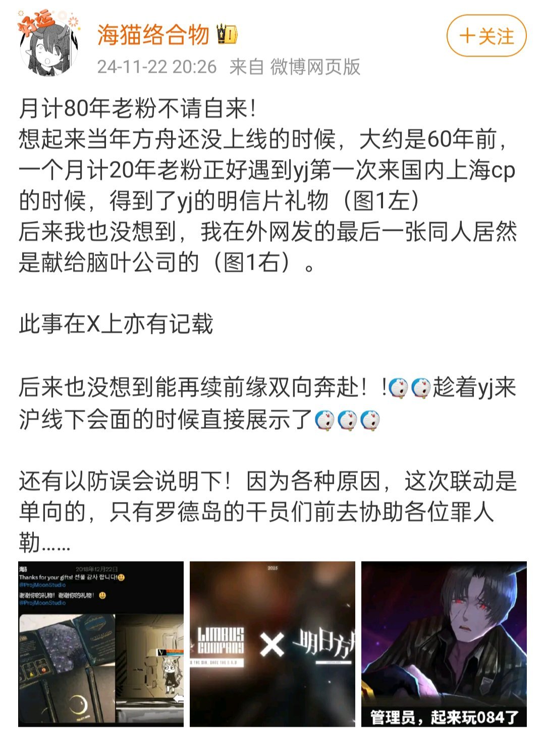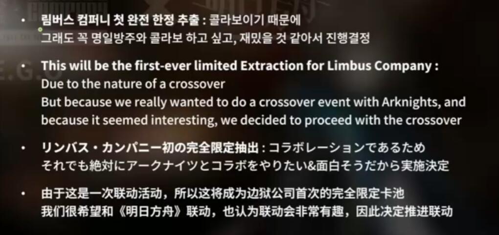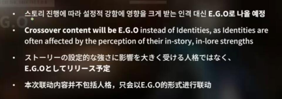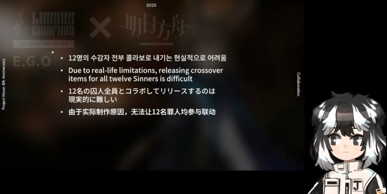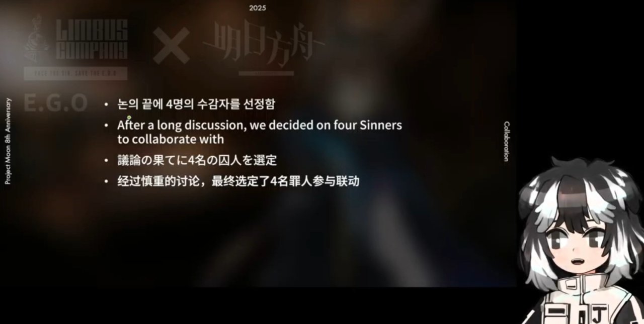 同时月计方面还进行了说明,会根据联动干员的技能和服装设计来进行对罪人EGO的设计,同时本次联动不包含人格,只是以EGO的方式联动。