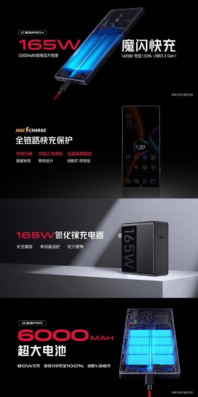 紅魔 8Pro+:5000mAh + 165W 魔閃快充,14 分鐘可充至 100%,全鏈路快充保護