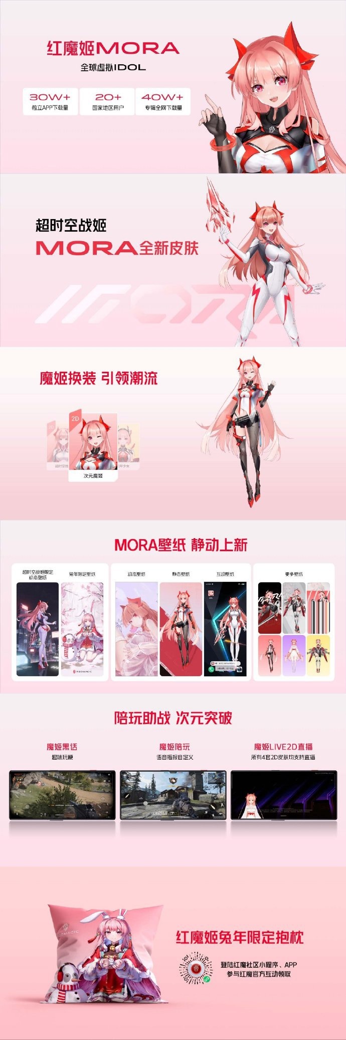 紅魔的二次元形象“紅魔姬”也迎來改進,紅魔姬 MORA 的 App 下載量突破 30 萬,官方宣佈帶來超時空戰姬全新皮膚、魔姬換裝、魔姬黑話、魔姬陪玩、LIVE2D 直播等新功能。