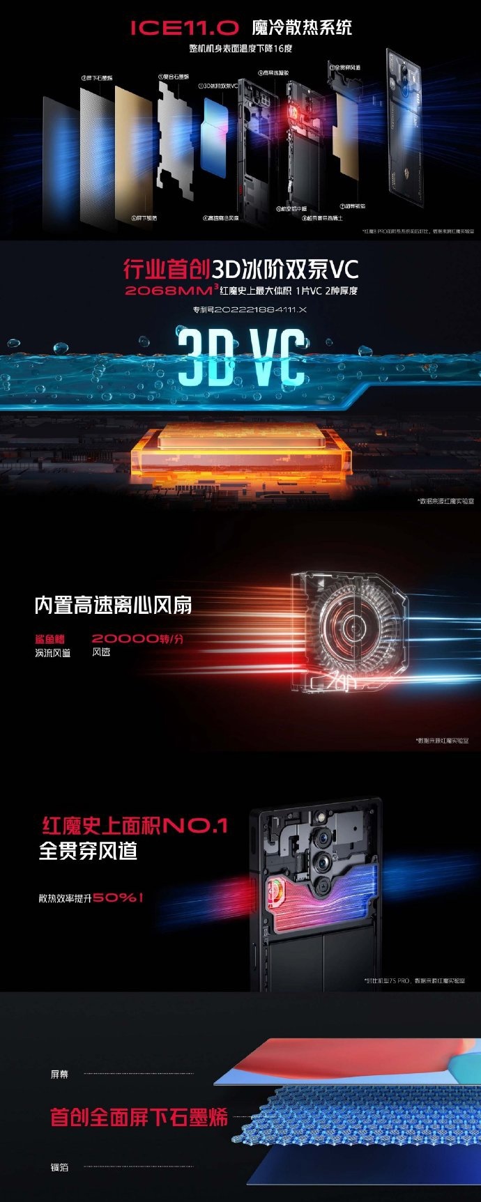 散熱方面,該機搭載 ICE 11.0 魔冷散熱系統:內置風扇 + 全貫穿風道、首創 3D 冰階雙泵 VC 液冷、屏下石墨烯等多達 10 層散熱材料,整機機身表面溫度下降 16°C。該機還配有 Magic GPU 自研穩幀引擎,針對性優化掉幀場景。