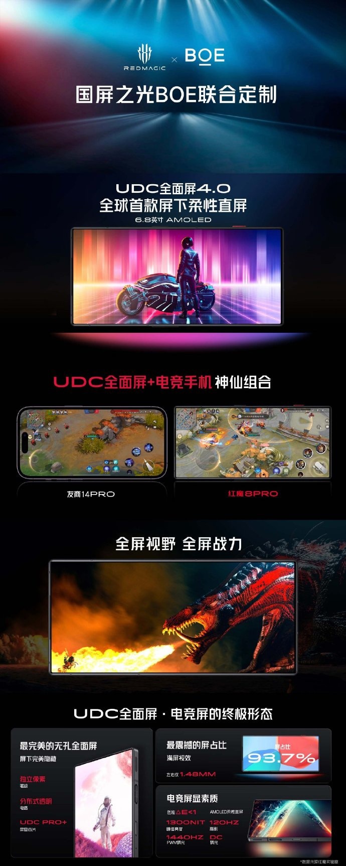 紅魔 8 Pro 採用了6.8 英寸 2480×1116 京東方柔性 OLED 直屏,號稱全球首款屏下柔性直屏,屏佔比達 93.7%,左右邊框僅 1.48mm,支持 PWM 調光 + DC 調光、120Hz 刷新率、960Hz 觸控採樣率、峯值亮度 1300nit、10bit 色深、100% DCI-P3 色域,還配有屏下指紋識別、屏下前攝。