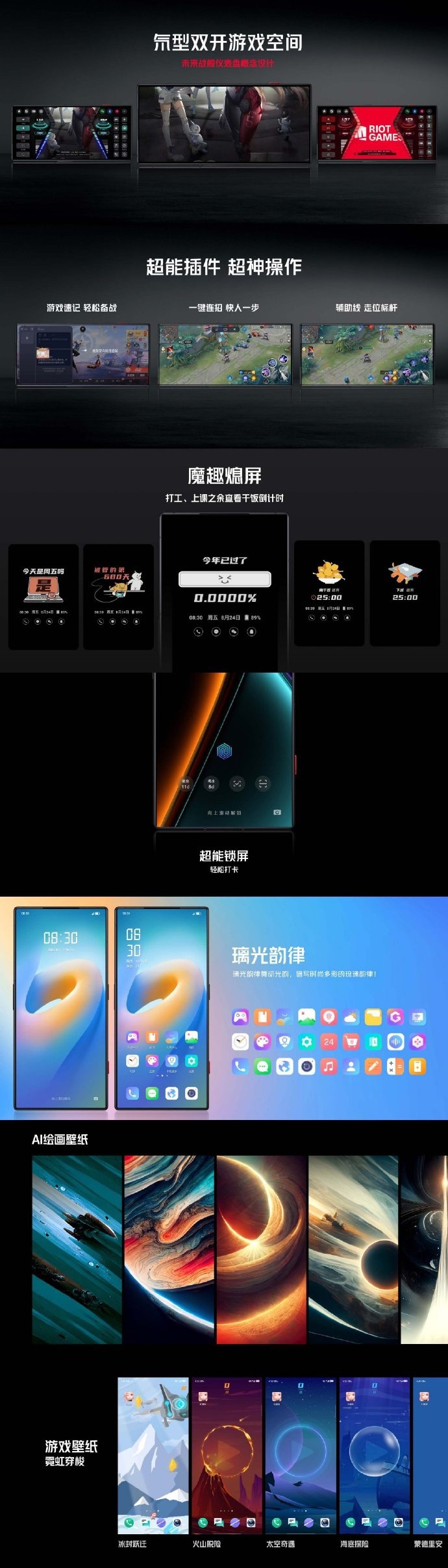 紅魔 8 Pro 還在系統方面進行了多項優化,搭載全新 REDMAGIC OS 6.0,配備氘型雙開遊戲空間、魔趣熄屏、超能鎖屏、AI 繪畫壁紙和遊戲壁紙。