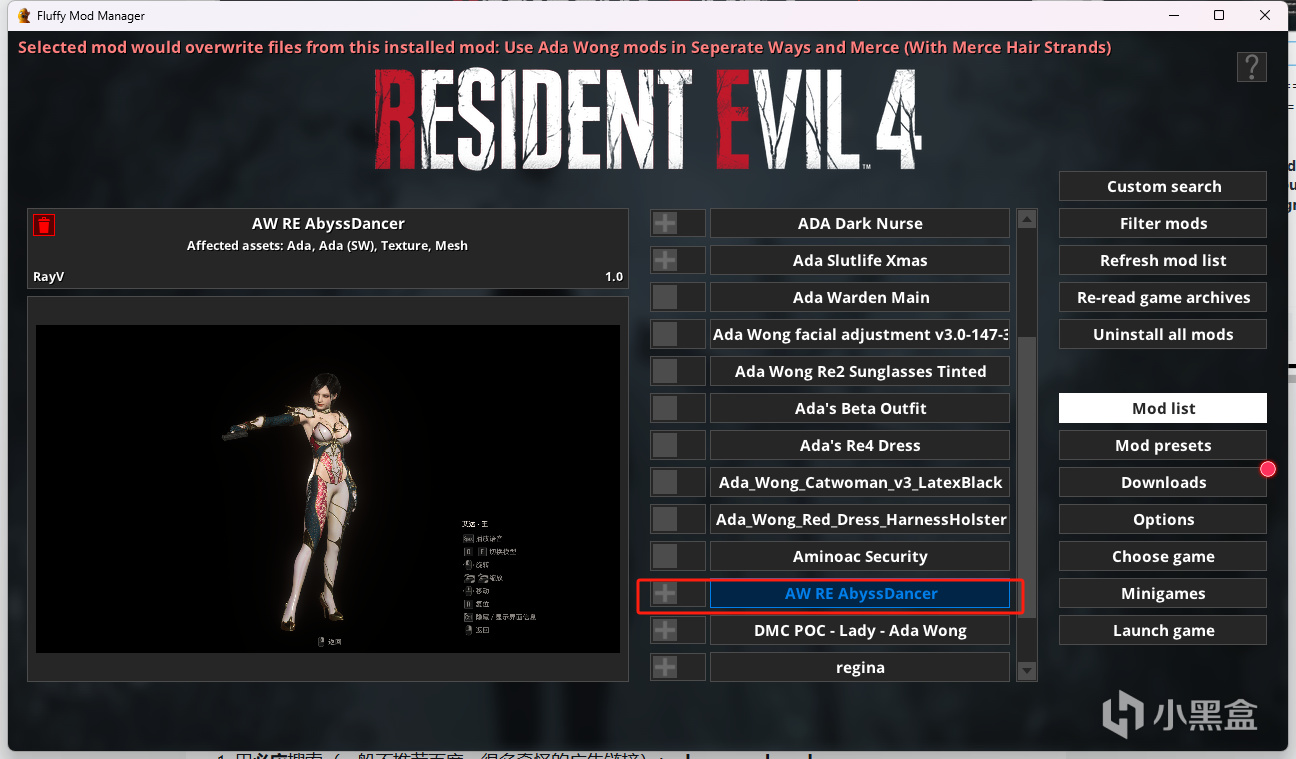 ①choose game:选择resident evil 4 remake;②mod list 正常一开始都是为空的