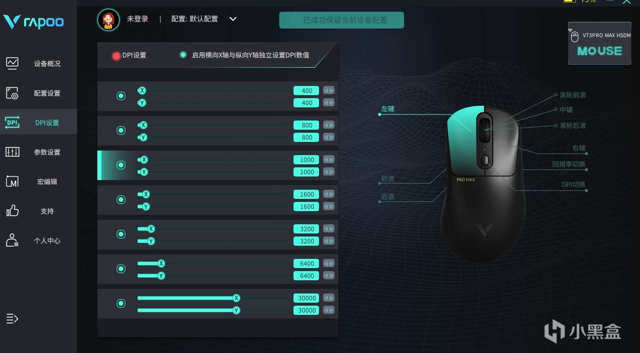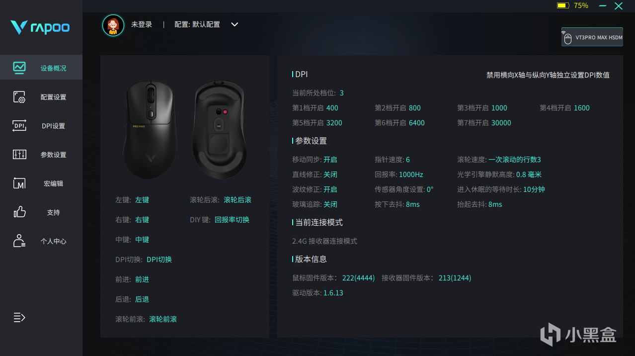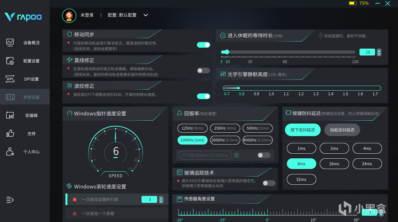 硬件优秀,软件也不拉胯。我们可以在电脑上下载雷柏软件对鼠标进行更加细致的调教,当然直接把鼠标插上也是可以直接使用的。软件主界面可以显示鼠标的各种设置分析,我们可以进行各种按键的自定义和设置DPI。另外往下面翻一翻还有更加专业光学引擎静默高度、按键防抖延迟、玻璃追踪技术、传感器角度调整等。