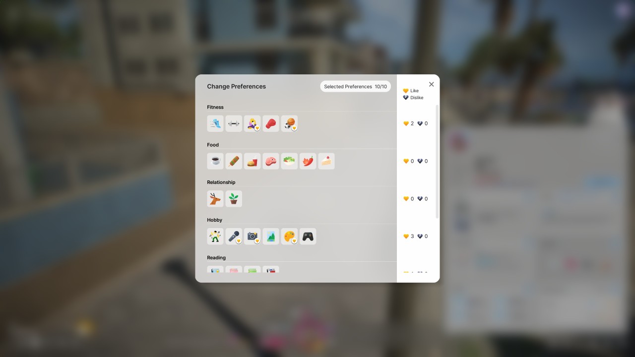但 inZOI 中至多能選擇10種愛好相關的偏好,比如喜歡蛋糕、喜歡運動等,沒有對性格、吸引力等的塑造,稍顯單薄。