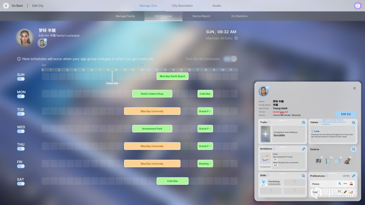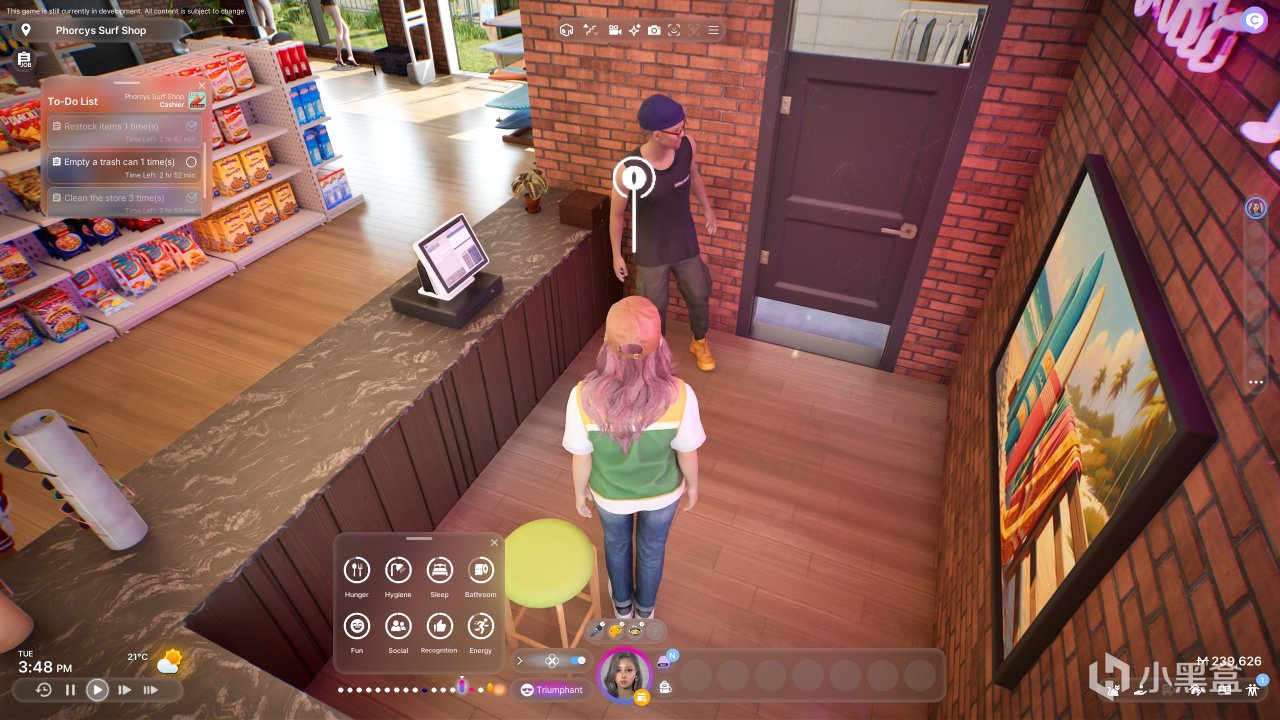 小人想要做的事情以及小人的生理需求等都整合進了下方的欄目中,完成小人想要做的事情能夠給小人帶來一些正面的狀態,完成交互能夠提升技能,這部分跟 Sim 4 相似,我不再贅述。