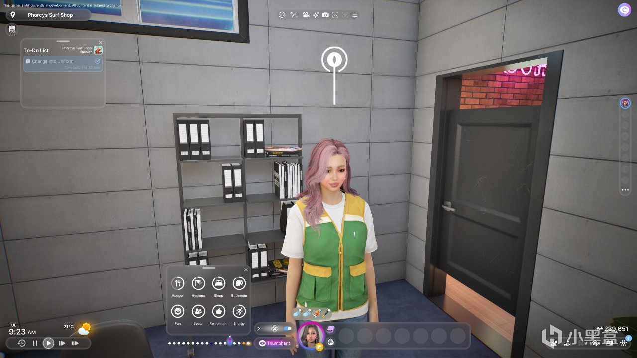 到點上班,換上商店制服,然後完成左上角的打工任務即可,關鍵是打工任務就是坐着守櫃檯、補貨、打掃衛生而已,遊戲中兩個小時就可以幹完,但是你必須要工作7還是8小時,剩下時間你就只能讓小人自動工作,乾等着,啥都幹不了。