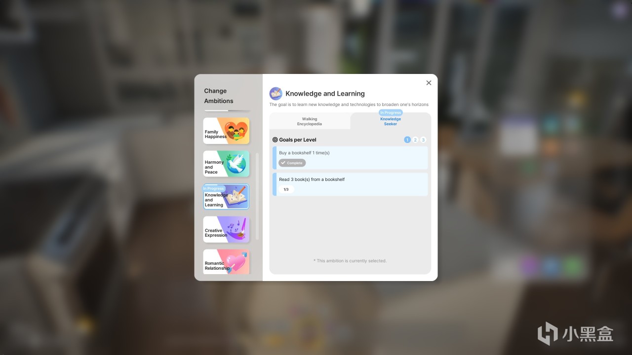 右下角的功能欄可以向AI貓貓詢問遊戲相關的攻略,也能看到角色卡片,展示了人物的價值觀、抱負、愛好等信息,其中抱負是階段性的目標,和 Sim 4 也非常相似,比如“Knowledge and Learning”抱負的起始階段目標是買一個書架,從書架上讀3本書,如此種種。