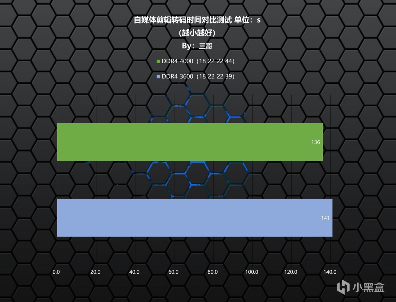 在该测试中,超频后相较XMP频率,视频转码所花的时间降低了5s,看似不多,但积少成多下来,对视频剪辑效率的提升也是非常可观的。