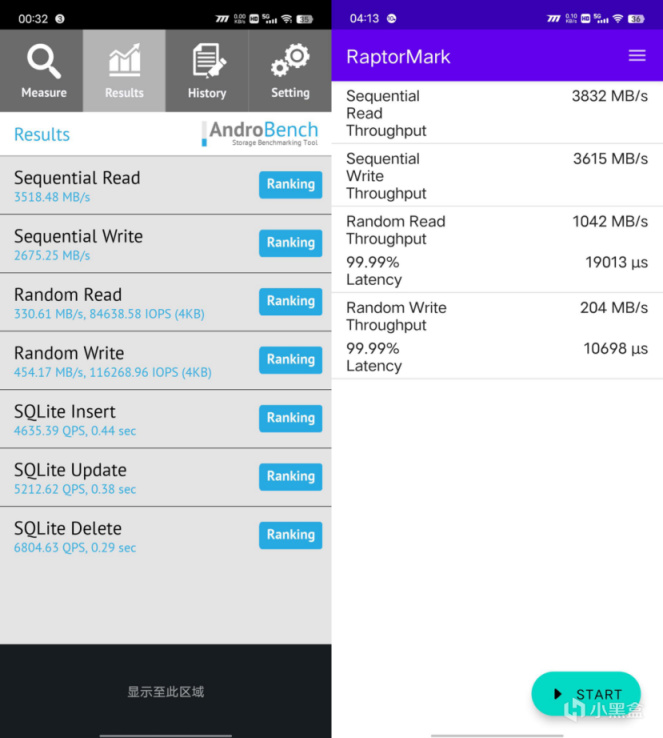 RaptorMark闪存测试顺序读取速度为3832 MB/s,顺序写入为3615 MB/s,随机读取为1042 MB/s,随机写入为204 MB/s。