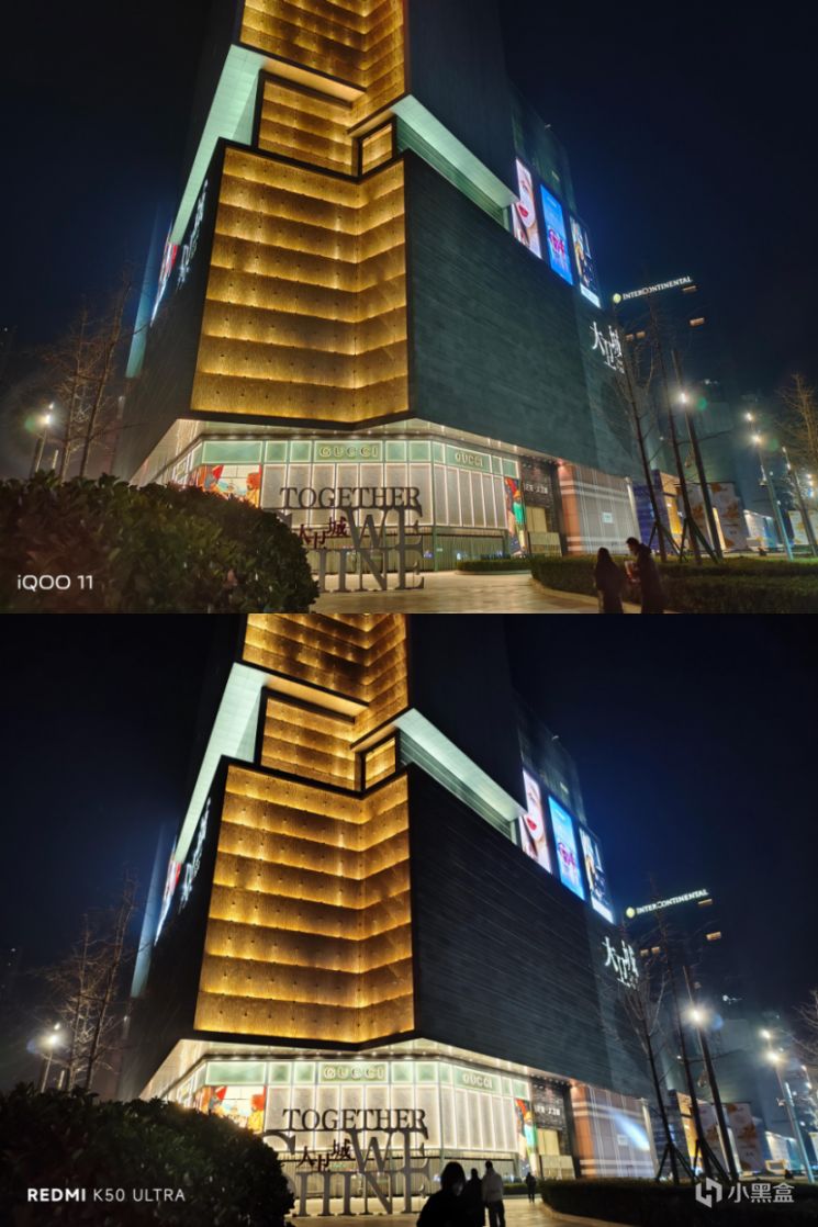 可见,iQOO 11夜景表现符合它的定位——旗舰,好过Redmi K50至尊版这种性价比向旗舰不少,毕竟价格在这儿,但距离影像旗舰还差点。