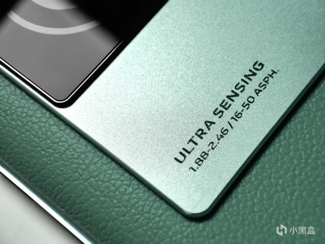 下方金属部分,标注了“ULTRA SENSING”超感影像、“1.88-2.46 / 16-50 ASP.”镜头参数字样。右侧黑色矩形内则为Flicker Sensor防闪烁传感器,整块金属有反光倒角处理。