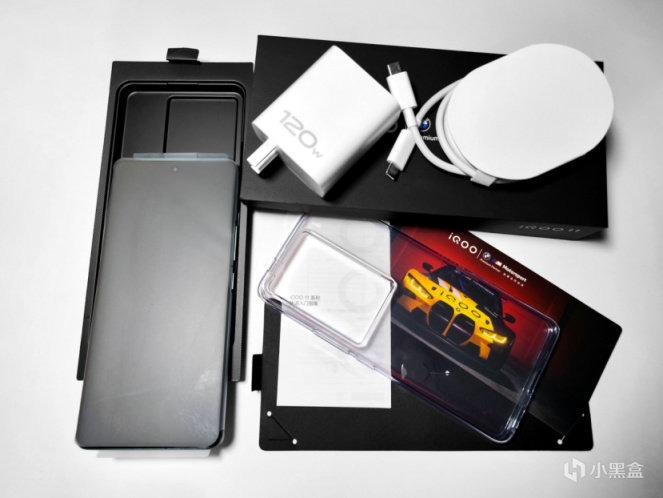 还有120W电源适配器、USB Type-C数据线、卡针、清水软保护壳、快速入门指南。固定卡针的卡片上,还卡了张iQOO同BMW Motorsport联名合作的纸卡。