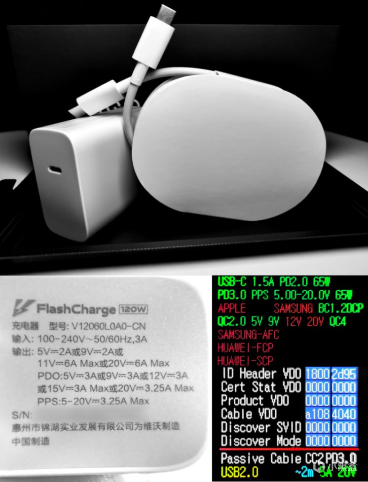 FlashCharge充电头型号为V12060L0A0-CN,最大输出20V 6A(120W),兼容PD 3.0、QuickCharge 4协议,由惠州锦湖实业制造。
