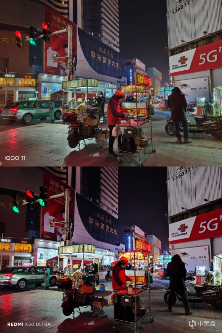 而在这组中,iQOO 11依然偏绿,Redmi K50至尊版把墙面还原的则有点偏红了。小摊的灯箱处理,这次,我个人更喜欢K50至尊版的高饱和风格了,拍出了市井感。