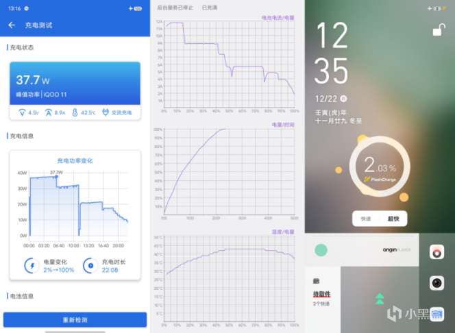 作为等效5000mAh(双电芯2500mAh)电池机型,iQOO 11开启超快模式后从1%~100%充电最快用时22分8秒,这个成绩在120W机型当中不算优秀,但日用快的绰绰有余。