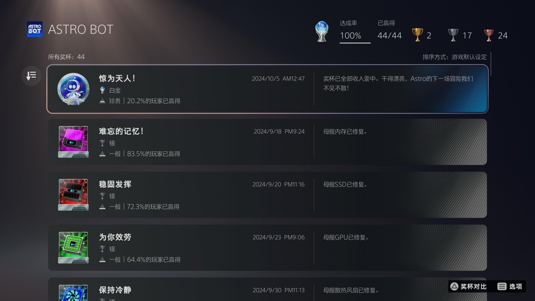 本作可以算上白金神作,以小编个人经历为例,集齐100%奖杯共花费18小时。除了部分强制一命通关的高难竞速关卡外,几乎是没有任何难度,适合奖杯收集党。