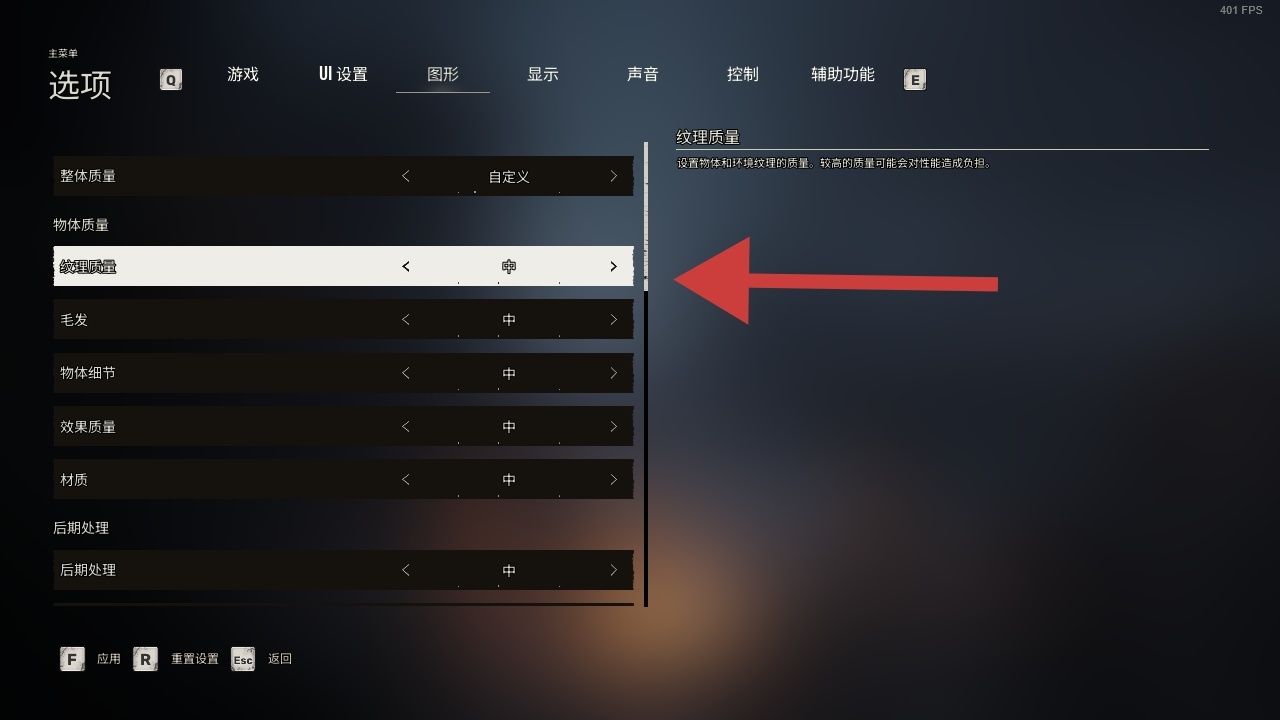 其次纹理质量过于显卡显存,可适当调节至“低”